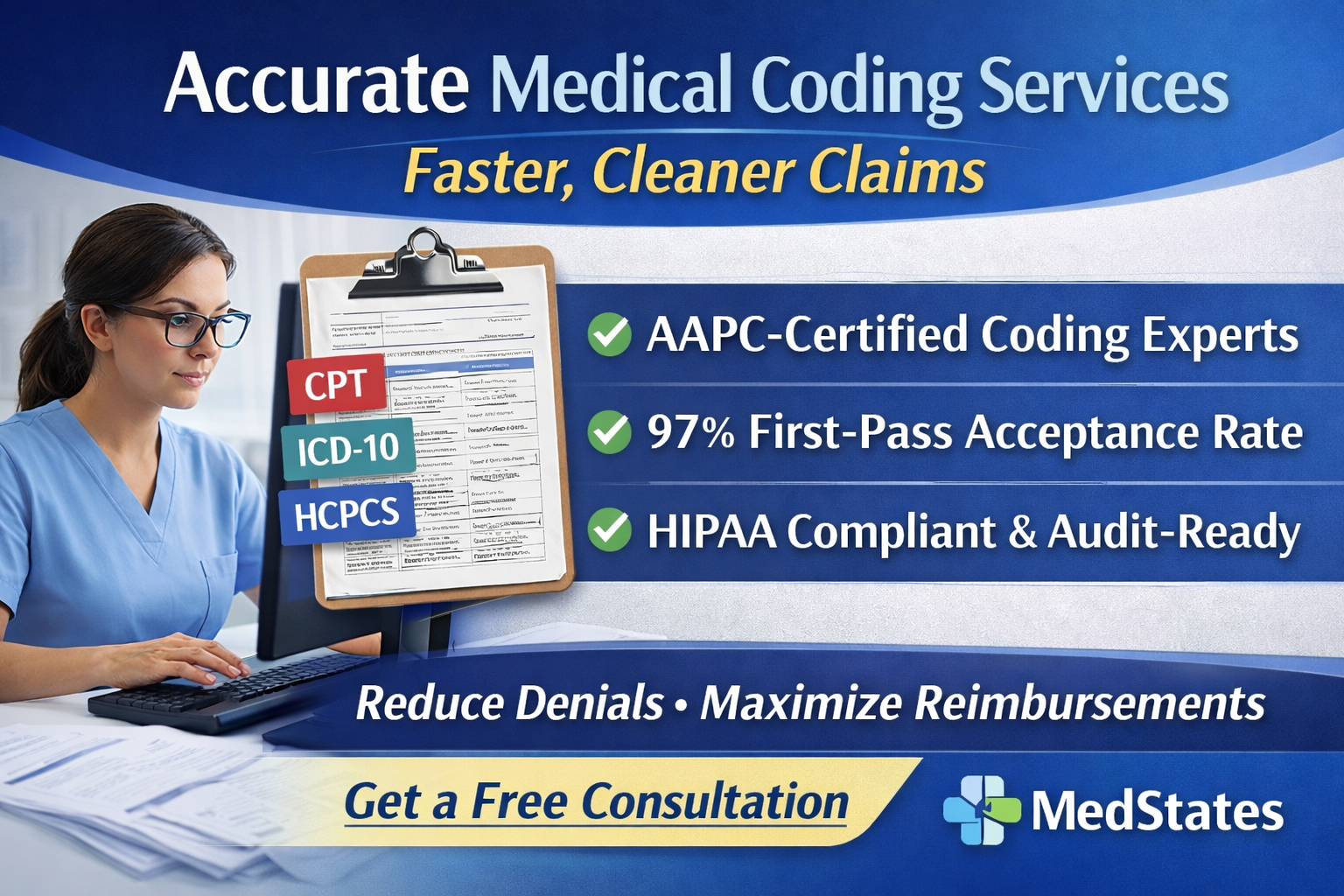 MedStates provides accurate medical coding services powered by AAPC-certified medical coders who apply CPT, ICD-10, and HCPCS codes with precision. Our specialty-aligned coding approach reduces preventable denials, improves first-pass acceptance, and helps practices get paid faster. With a 97% clean claim rate, we deliver audit-ready, payer-compliant medical coding services that protect revenue and simplify your billing workflow.